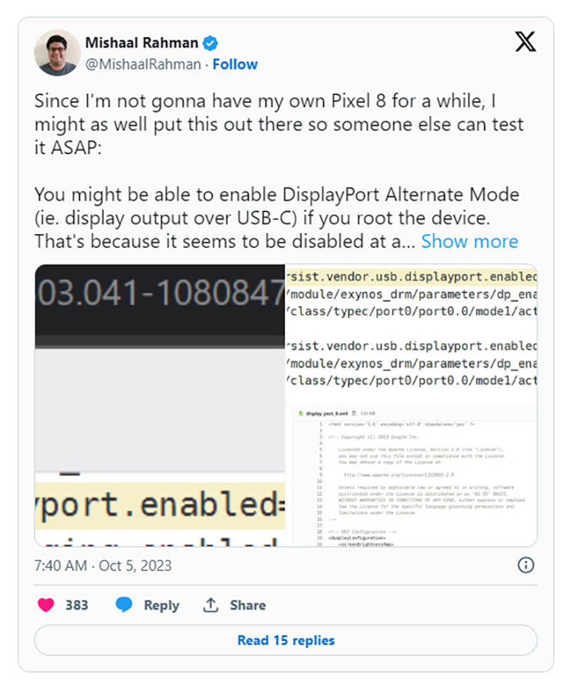 បន្ទាប់ពីការបដិសេធរបស់ក្រុមហ៊ុន Google ពាក់ព័ន្ធទៅនឹងការទ្រទ្រង់ទៅលើមុខងារ DisplayPort Connection នៅលើស្មាតហ្វូន Pixel 8 Series លោក Mishaal Rahman បាននិយាយថា មុខងារនេះ គឺអាចដំណើរការនៅលើស្មាតហ្វូននេះ។ នៅក្នុងការសិក្សាមួយជាមួយនឹងអ្នកតេស្តម្នាក់ទៀតនោះ លោក Mishaal បានបញ្ជាក់ថា មុខងារ DP Alt Mode នៅលើស្មាតហ្វូន Pixel 8 និង Pixel 8 Pro កំពុងតែដំនើរការ ប៉ុន្តែក្រុមហ៊ុននេះ បានបិទទៅលើមុខងារនេះតាមរយៈ firmware update។