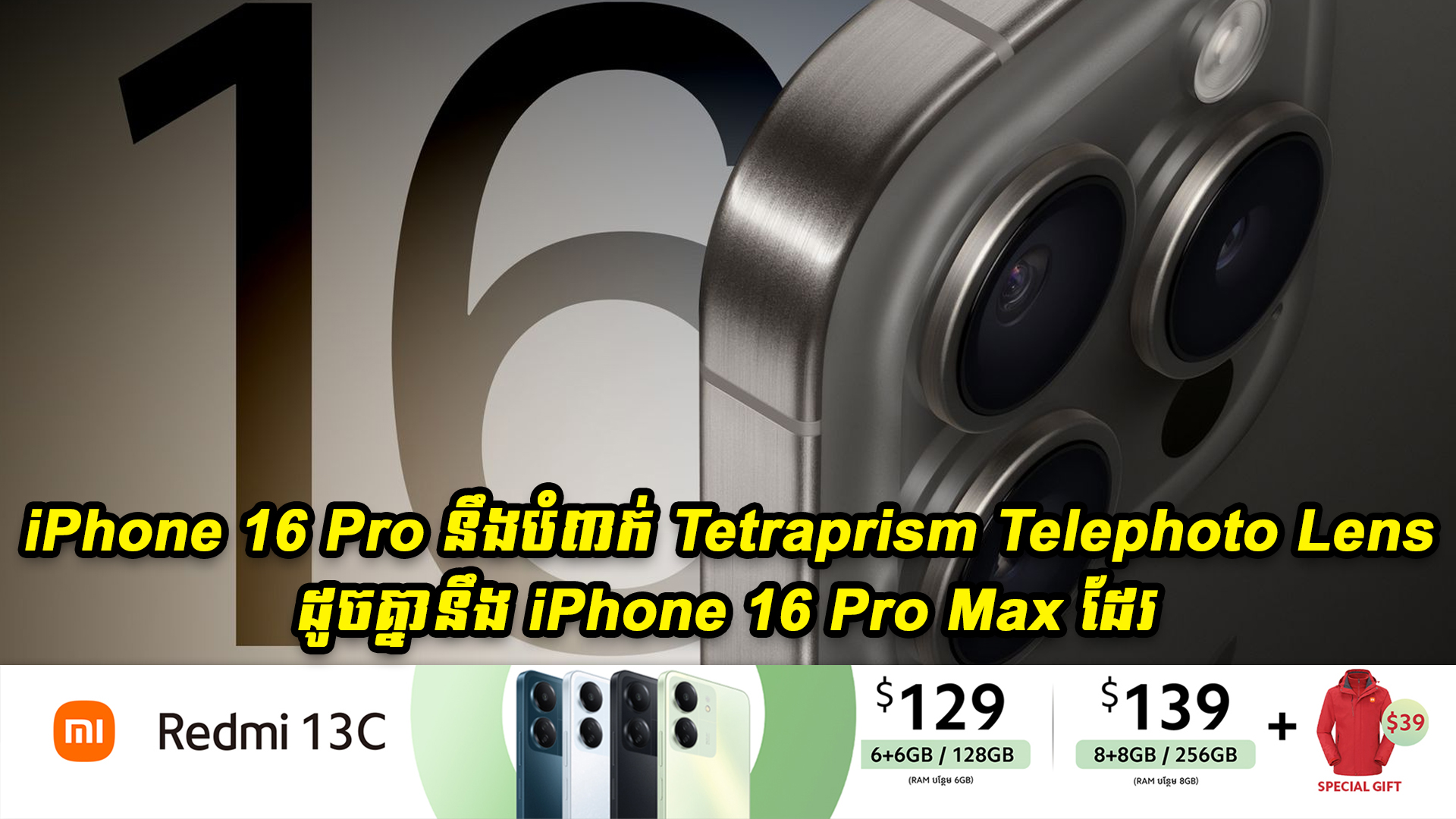 ថ្មីៗនេះបើតាមរយះរបាយការណ៍ព័ត៌មានដែលបានចុះផ្សាយនៅលើគេហទំព័រ Macrumors បានឲ្យដឹងថា Apple នឹងប្រើប្រាស់លែនកាមេរ៉ា Tetraprism Telephoto នៅលើ iPhone ម៉ូដែល Pro ទាំងពីរ គឺ iPhone 16 Pro និង iPhone 16 Pro Max ដែលនឹងមកដល់នៅក្នុងឆ្នាំ 2024។ ដែលព័ត៌មាននេះ គឺស្របគ្នានឹងរបាយការណ៍របស់កំពូលវិភាគផលិតផល iDevices របស់ Apple លោក Ming Chi-Kuo កាលពីខែកញ្ញា ក៏ដូចជាបណ្តាញសារព័ត៌មានកូរ៉េខាងត្បូង The Elec ដែលបានចេញផ្សាយកាលពីដើមខែធ្នូនេះផងដែរ។