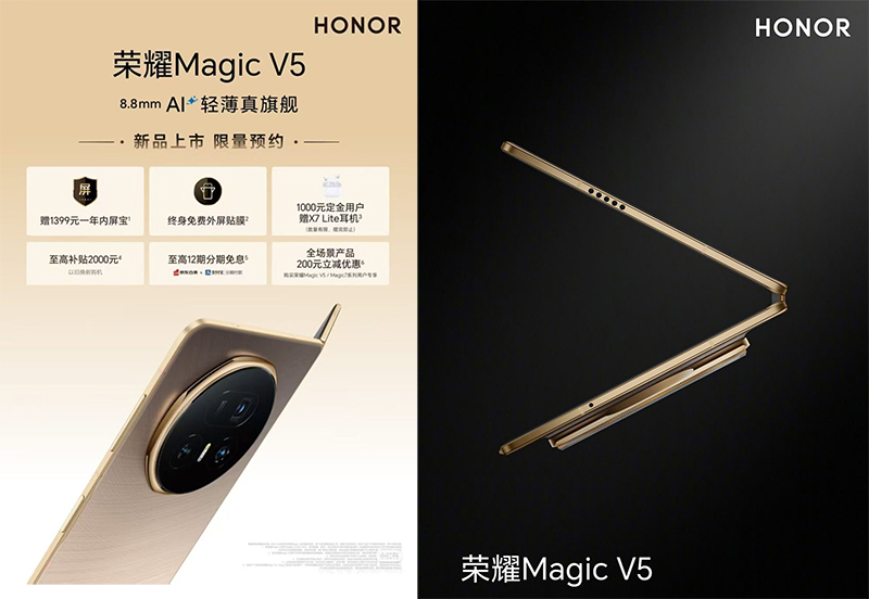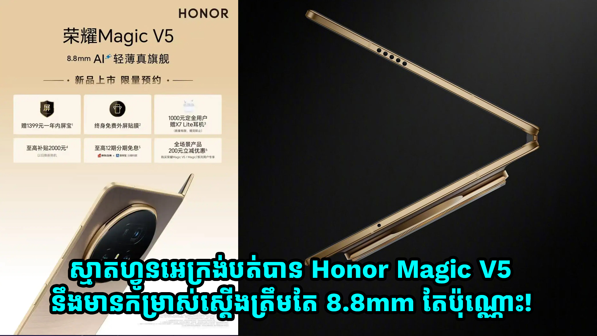 នៅថ្ងៃនេះ យោងតាមនាយកប្រតិបត្តិរបស់ក្រុមហ៊ុន Honor បានបង្ហើបថា ស្មាតហ្វូនអេក្រង់បត់បានថ្មីម៉ូដែល Magic V5 ដែលត្រៀមនឹងបង្ហាញវត្តមានខាងមុខនេះ គឺមានរូបរាងស្លីមជាងស្មាតហ្វូនអេក្រង់បត់បានរបស់ OPPO ម៉ូដែល Find N5 ថែមទៀតផង។ បើមើលទៅលើរូបភាព Poster ថ្មីដែលទម្លាយនៅលើ Weibo ពេលនេះ បានទម្លាយនូវកម្រាស់ និងកាមេរ៉ាខាងក្រោយរបស់ស្មាតហ្វូនអេក្រង់បត់បាន Magic V5 នេះហើយ។
