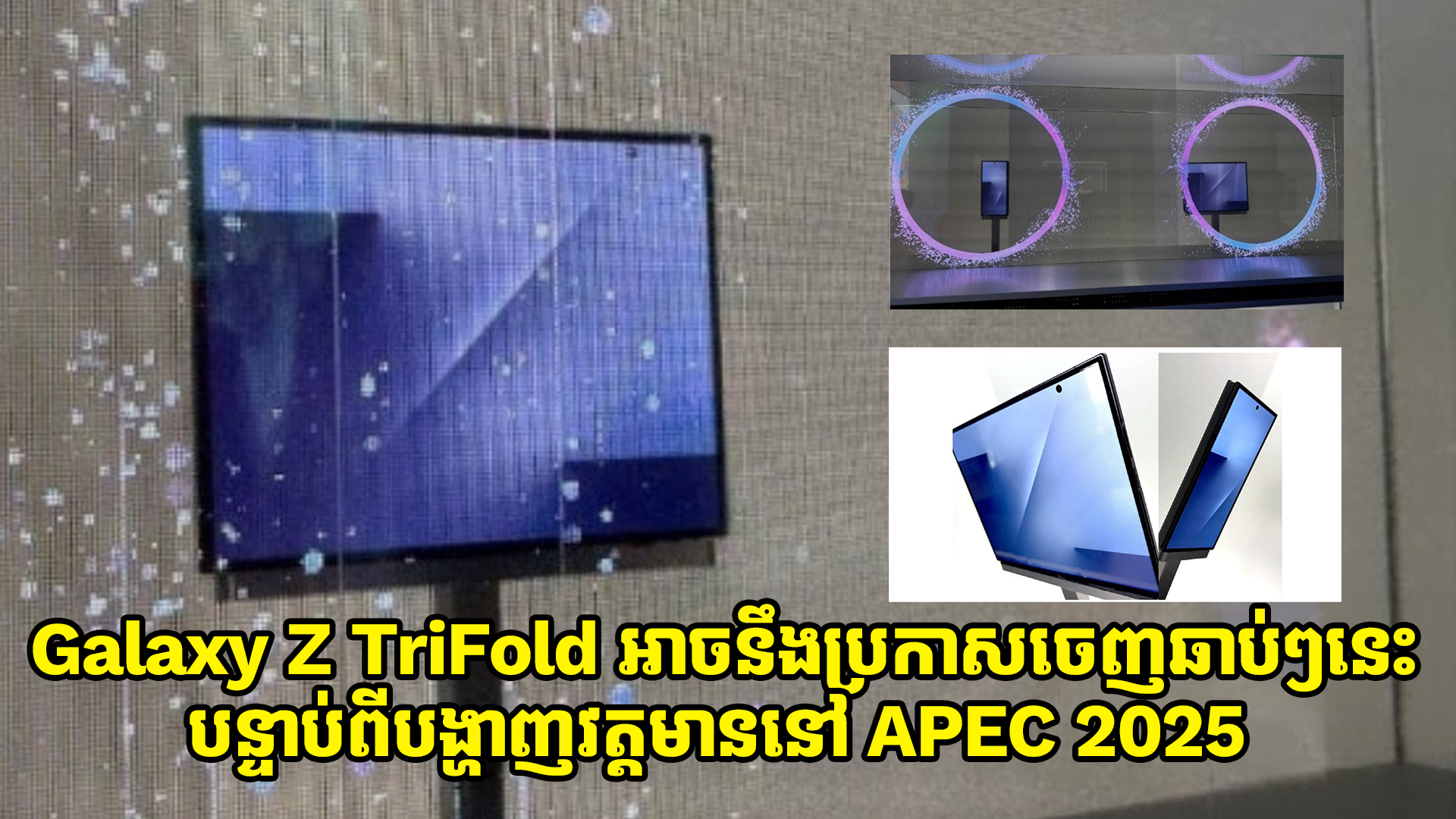 បន្ទាប់ពីការបែកធ្លាយនិងពាក្យចចាមអារ៉ាមជាច្រើនអស់រយៈពេលជាច្រើនឆ្នាំនេះនៅទីបំផុតក្រុមហ៊ុន Samsung បានត្រៀមខ្លួនរួចជាស្រេចហើយនៅក្នុងការបង្ហាញចេញជាផ្លូវការណ៌នូវស្មាតហ្វូនអេក្រង់បត់បាន 3 តង់របស់ខ្លួនហើយ។បើមើលទៅលើស្មាតហ្វូនអេក្រង់បត់បានថ្មី Galaxy Z TriFoldនេះត្រូវបានទម្លាយចេញមុនហើយនៅព្រឹត្តិការណ៍ APEC 2025 ដែលរៀបចំឡើងនៅសប្តាហ៍នេះនៅក្នុងប្រទេសកូរ៉េខាងត្បូងដោយក្រុមហ៊ុន Samsung បានដាក់បង្ហាញស្មាតហ្វូនថ្មីនេះនៅក្នុងប្រអប់កញ្ចក់ដែលមិនទាន់មានអ្នកណាម្នាក់អាចប៉ះពាល់ស្មាតហ្វូននេះបាននោះទេ។