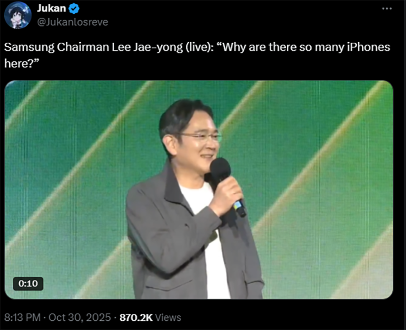 ប៉ុន្តែបើមើលទៅលើរូបភាពដូចជាកំប្លែងបន្តិចដោយសារតែនៅក្នុងព្រឹត្តិការណ៌នោះគឺឃើញហ្វេនៗនិងអ្នកប្រើប្រាស់ជាច្រើនបានប្រើប្រាស់នូវ iPhones ថតសកម្មភាពរបស់គាត់។សូមជំរាបថាកាលពីសប្តាហ៍មុននេះលោក Jay Y. Lee អគ្គនាយករបស់ក្រុមហ៊ុន Samsung និងលោក Jensen Huang អគ្គនាយករបស់ក្រុមហ៊ុន NVIDIA បានជួបគ្នានៅក្នុងទីក្រុងសេអ៊ូលកូរ៉េខាងត្បូងហើយមេដឹកនាំទាំងពីរនេះបានដើរលេងពិសារស្រាបៀរនិងញាំមាន់បំពងដែលនេះដោយបង្ហាញអំពីទំនាក់ទំនងយ៉ាងជិតស្និទ្ធិរបស់ក្រុមហ៊ុនទាំងពីរនេះ។ នៅក្នុងពេលនោះ លោក Lee លាន់មាត់និយាយថា ហេតុអ្វីក៏មាន iPhones ច្រើនម្ល៉េះនៅទីនេះ? គ្រាន់ តែគាត់និយាយចប់ ក៏មានការសើចយ៉ាងគគ្រឹកគគ្រេងនៅក្នុងទីប្រជុំនេះ។