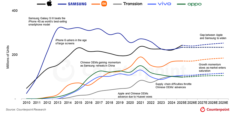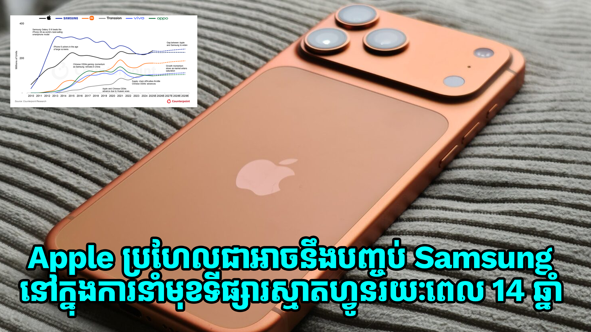 Samsung គឺជាក្រុមហ៊ុនផលិតស្មាតហ្វូនដែលត្រូវបានគេមើលឃើញថា បាននាំមុខទីផ្សារស្មាតហ្វូនពិភពលោក អស់រយៈពេលជាច្រើនឆ្នាំមកហើយ។ យោងតាមការព្យាករណ៍ចេញពី Counterpoint Research នាពេលថ្មីៗនេះ បានបញ្ជាក់ថា ឆ្នាំនេះ អាចនឹងដល់ពេលវលាសម្រាប់ក្រុមហ៊ុន Samsung សម្រាប់ការនាំមុខរបស់ខ្លួនហើយ។ តាមការការព្យាករណ៌របស់ Counterpoint បានរំពឹងថា ក្រុមហ៊ុន Apple អាចនឹងត្រឡប់មកកាន់ចំណាត់ថ្នាក់លេខ 1 វិញនៅចុងឆ្នាំនេះ ខណៈដែលក្រុមហ៊ុននេះ មិនធ្លាប់ជាប់ចំណាត់ថ្នាក់លេខ 1 តាំងពីឆ្នាំ 2011 មកម្ល៉េះ។