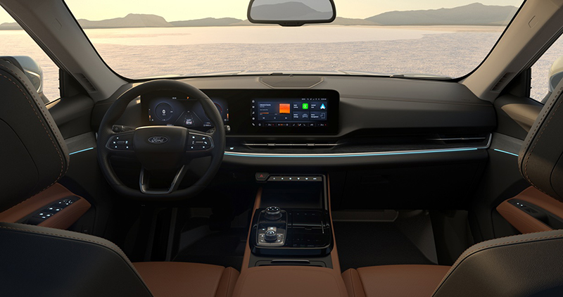 ក្រឡេកទៅមើលផ្នែកខាងក្នុងវិញ Ford Territory 2026 បានអាប់ដេតកាប៊ីនខាងក្នុងថ្មី ឌីហ្សាញថ្មី កាន់តែប្រណីត និងទំនើបផងដែរ ជាពិសេសនោះគឺ អេក្រង់ភ្លោះនៅខាងមុខនេះតែម្តង ដោយលើកនេះមាន កុងទ័រឌីជីថលទំនើប ទំហំ 12.3 អ៉ីញ បង្ហាញរូបភាពច្បាស់ ត្រជាក់ភ្នែក ងាយស្រួលមើល និងអេក្រង់ Touchscreen កណ្តាលទំហំ 12 អ៉ីញ ដំណើរការដោយបច្ចេកវិទ្យា SYNC ជំនាន់ថ្មី ទំនើប និងងាយស្រួលប្រើប្រាស់ ហើយបានរៀបចំ Interface ប្រើប្រាស់ថ្មី កាន់តែទំនើប និងដំណើរការបានប្រសើរជាងមុន ទៅទៀត។