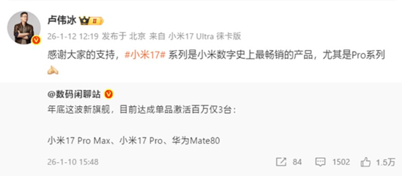 ជាមួយនិងដំណឹងនេះ ដៃគូរបស់ Xiaomi Group partner និងលោកអគ្គនាយកគ្រប់គ្រងក្រុមហ៊ុន Lu Weibing ក៏បានធ្វើចែកចាយនៅលើបណ្តាញសង្គមចិន ថ្លែងអំណរគុណដល់អ្នកគាំទ្ររបស់ខ្លួនផងដែរ។ លោកបានបន្ថែមថា Xiaomi 17 series គឺជាស្មាតហ្វូនថ្នាក់ប្រណិតដែលលក់ដាច់ច្រើនជាគេបំផុតនៅក្នុងប្រវត្តិរបស់ក្រុមហ៊ុន Xiaomi ផងដែរ។