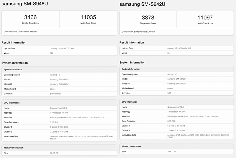 តាមរយៈបញ្ជីខខាងលើនេះ បានបង្ហាញថា Galaxy S26 Ultra និង Galaxy S26+ គឺមានលេខកូដ SM-S948 និង SM-S942 ហើយនឹងមានការបញ្ជាក់ពីបន្ទះឈីប ទំហំរ៉េម និងប្រព័ន្ធប្រតិបត្តិការណ៌ផងដែរ។ ស្មាតហ្វូនជំនាន់់់ថ្មីទាំងពីរនេះ គឺដំណើរការនៅលើបន្ទះឈីប Qualcomm Snapdragon 8 Elite Gen 5 SoC ហើយនឹងមានបញ្ជាក់ពីក្រាហ្វិកកាត Adreno 840 GPU ទៀតផង។ សម្រាប់ល្បឿនៃបន្ទះឈីបនេះ គឺមានល្បឿនខុសគ្នា ទៅលើម៉ូដែលស្តង់ និងម៉ូដែលប្រណិត។