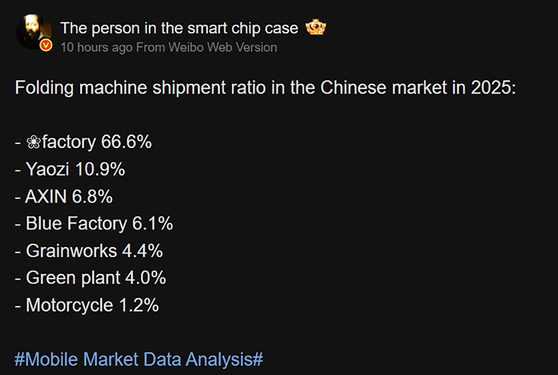ក្រុមហ៊ុន Vivo និង Xiaomi គឺមានចំណែកទីផ្សារ 6.1% និង 4.4% រៀងគ្នានៅក្នុងទីផ្សារស្មាតហ្វូនបត់បានរបស់ចិន។ ក្រុមហ៊ុន OPPO ជាប់លេខ 6 ដែលមានចំណែកទីផ្សារចំនួន 4.0% ហើយក្រុមហ៊ុន Motorola គឺស្ថិតនៅចំណាត់ថ្នាក់ចុងក្រោយគេ។ ការប្រជែងនឹងមានការកើនឡើងខ្លាំងនៅក្នុងឆ្នាំ 2026 នេះដោយមានការរំពឹងថា ក្រុមហ៊ុន Apple នឹងចូលរួមប្រជែងនៅក្នុងទីផ្សារស្មាតហ្វូនបត់បាននេះផងដែរ។ ស្មាតហ្វូន iPhone Fold នេះ មានរូបរាងស្រដៀងគ្នាទៅនឹងស្មាតហ្វូន Huawei Pura X ផងដែរ៕