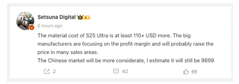 យោងតាមគណនីទម្លាយព័ត៌មានល្បីឈ្មោះក្នុងប្រទេសចិនឈ គឺ Digital Chat Station បាននិយាយថា Samsung Galaxy S25 Ultra នឹងកើនតម្លៃខ្ពស់ជាងតម្លៃ Galaxy S24 Ultra ប្រមាណ $110 ការកើនតម្លៃនេះ ក៏ព្រោះតែកត្តាតម្លៃសមាសធាតុផលិត (BoM) មានតម្លៃថ្លៃ។