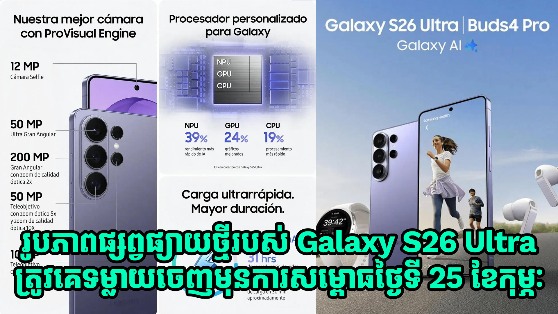 នៅថ្ងៃនេះ មានការបែកធ្លាយ Posters ថ្មីមួយ នៅមុនការដាក់សម្ពោធជាផ្លូវការនៅថ្ងៃទី 25 ខែកុម្ភៈ ដោយនៅក្នុងរូបភាពនោះបានបង្ហាញថា ស្មាតហ្វូន Galaxy S26 Ultra នេះ អាចមើលវីដេអូបាន 31 ម៉ោងនៅពេលសាកថ្មពេញម្តង។ តាមរយៈនៃការសមត្ថភាពស្មាតហ្វូនថ្មីនេះត្រូវបានគេបញ្ជាក់ថា គឺមានទំហំដូចគ្នាទៅនឹងការផ្សព្វផ្សាយរបស់ Galaxy S25 Ultra កន្លងមកអញ្ចឹង។