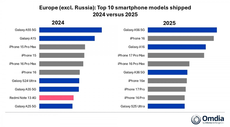 សម្រាប់ស្មាតហ្វូន Samsung ដែលលក់ដាច់ជាងគេនៅលើទីផ្សារទ្វីបអឺរ៉ុបកាលពីឆ្នាំ 2025 កន្លងទៅនេះ គឺទៅលើ Samsung Galaxy A56 និងមានការតាមពីក្រោយដោយ iPhone 16 និង Galaxy A16។ នៅក្នុងចំណោម top 10 វិញ គឺមាន 6 ម៉ូដែលរបស់ Apple និង 4 ម៉ូដែលជាស្មាតហ្វូនរបស់ Samsungs។