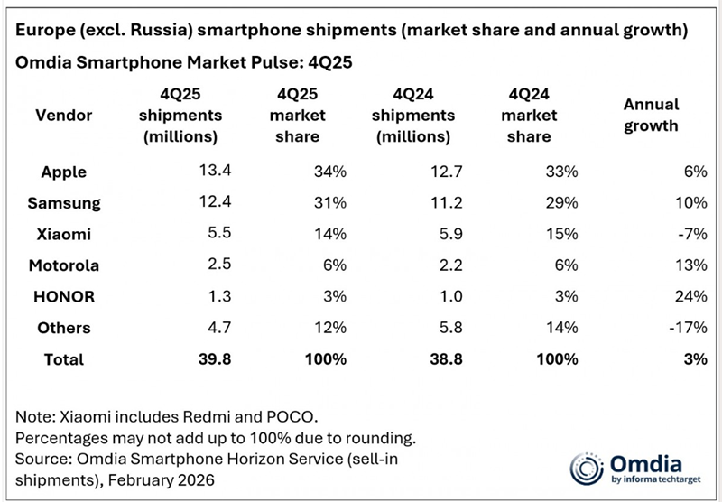 យោងតាមសេចក្តីរាយការណ៌ថ្មីដែលចេញដោយក្រុមហ៊ុន Omdia បានបង្ហាញថា កាលពីឆ្នាំ 2025 នេះ ស្មាតហ្វូនរបស់ក្រុមហ៊ុន Samsung បាននាំមុខដៃគូររបស់ខ្លួននៅលើទីផ្សារស្មាតហ្វូនក្នុងតំបន់អឺរ៉ុប មិនមានរាប់បញ្ចូលប្រទេសរុស្ស៊ីនោះទេ។ ផ្អែកតាមទិន្នន័យខាងលើនេះ Samsung លក់ស្មាតហ្វូនរបស់ខ្លួនាបាន 46.6 លានគ្រឿង ដែលស្មើរនិង 35% នៃចំណែកទីផ្សារសរុប។