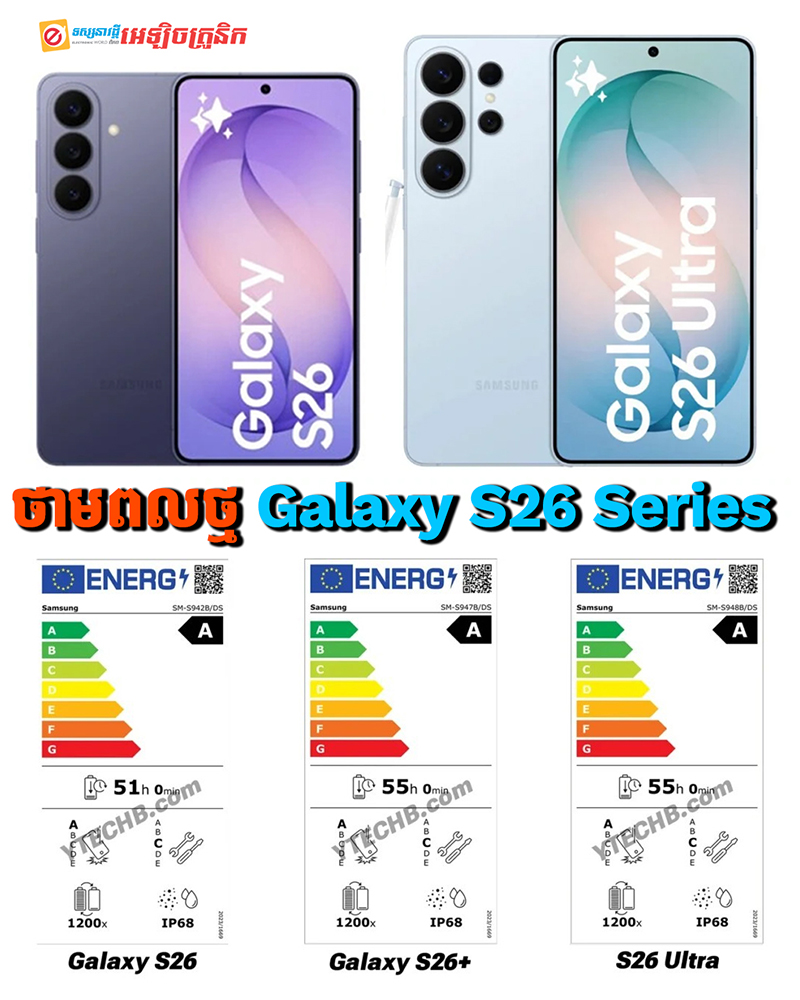 គិតត្រឹមម៉ោងនេះ ការប្រកាសចេញជាផ្លូវការណ៌របស់ស្មាតហ្វូនជំនាន់ថ្មី Samsung Galaxy S26, S26+ និង S26 Ultra នៅសល់មិនដល់រយៈពេល 48 ម៉ោងទៀតនោះទេ។ តាមការគ្រោងទុកព្រឹត្តុការណ៌ Galaxy Unpacked បង្ហាញវត្តមានស្មាតហ្វូនថ្មីនេះ នឹងធ្វើឡើងនៅថ្ងៃទី 25 ខែកុម្ភៈខាងមុខនេះហើយនៅថ្ងៃនេះ មុនការកម្មវិធីចូលមកដល់ ស្ថាប័ន EU Energy Labels បានបញ្ចេញនូវព័ត៌មានជាក់លាក់ទៅលើថាមពលថ្មដែលនឹងមានប្រើប្រាស់នៅលើស្មាតហ្វូនជំនាន់ថ្មីទាំងបីម៉ូដែលនេះហើយ។