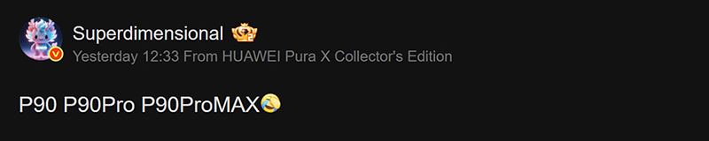 យោងតាមអ្នកទម្លាយ SuperDimensional ថ្មីនេះ ក៏បានបញ្ជាក់នូវឈ្មោះផ្លូវការណ៌របស់ស្មាតហ្វូនទាំង 3 នៃ Huawei Pura 90 Series: Pura 90, Pura 90 និង Pura 90 Pro MAX។ ផ្អែកទៅលើការបែកធ្លាយថ្មីនេះ វាហាក់ដូចជាក្រុមហ៊ុនHuawei បោះបង់ចោលនូវម៉ូដែល Ultra នៅក្នុងស្មាតហ្វូនត្រកូល Pura 90 series នេះជំនួសមកវិញដោយម៉ូឌែល PRO Max។