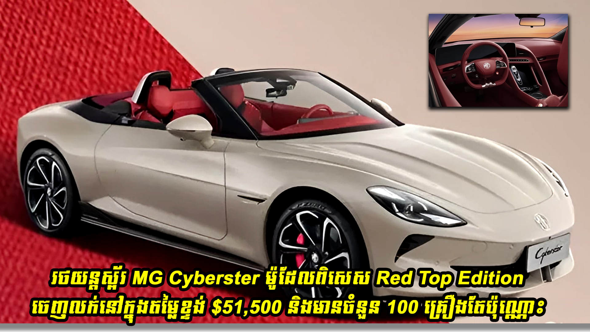 ក្រុមហ៊ុន MG ទើបតែបានប្រកាសបង្ហាញចេញរថយន្តប្រភេទ Super Sport ស៊េរីថ្មីម៉ូដែលពិសេសដែលមានឈ្មោះថា MG Cyberster Red Top Edition។ រថយន្តម៉ូដែលពិសេសនេះ មានតម្លៃ 365,800 យ័ន ឬប្រហែល $51,500។ រថយន្តប្រភេទ Electric Convertible Sport Car របស់ MG មួយនេះត្រូវបានរចនាជាមួយនឹងពណ៌សដែលក្រុមហ៊ុនហៅថា Pearl-White Pait ជាមួយដំបូលអាចបិតបើកបានដែលរចនាម៉ូតជាមួយនឹងពណ៌ក្រហមដែលជា Classic Colors នៃ MGA, MGB និងMG Magnette។