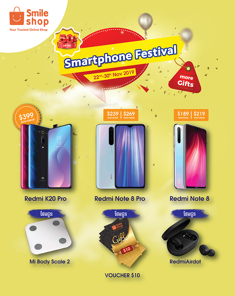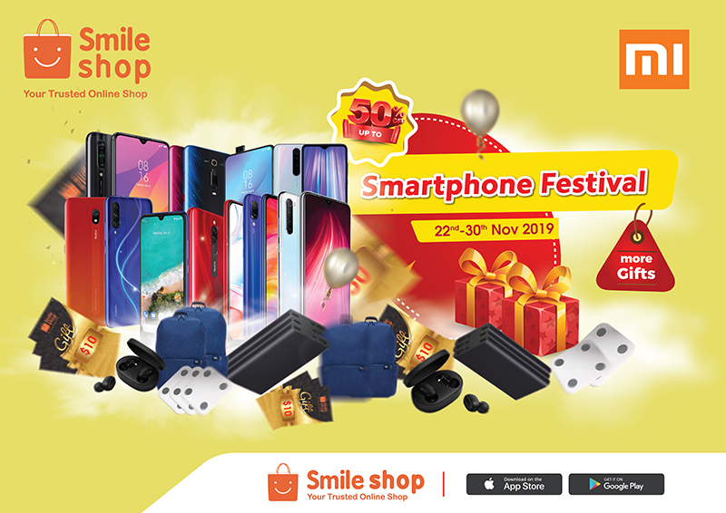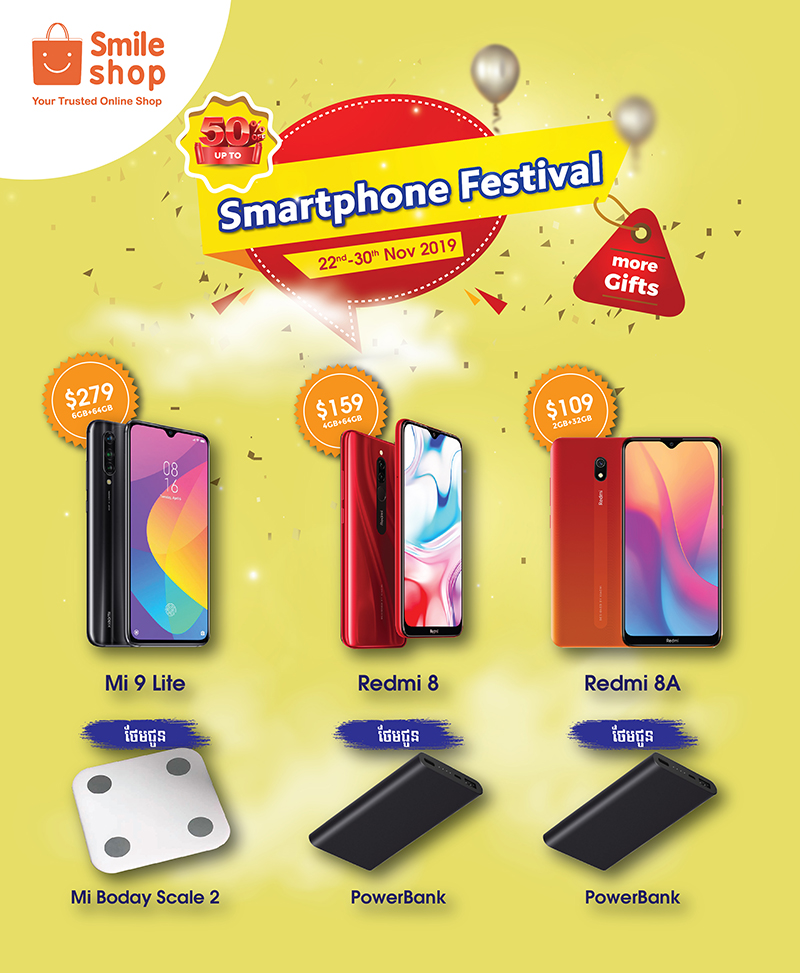 នៅថ្ងៃនេះ Smile Shop ដែលជាផ្សារលក់ទំនិញតាមប្រព័ន្ធអនឡាញ៏ឈានមុខគេនៅកម្ពុជា បានប្រកាស ផ្តល់នូវ ប្រូម៉ូស្សិនពិសេសអស្ចារ្យថ្មីមួយទៀតជូនដល់អតិថិជនទូរទៅ ដោយគ្រាន់តែធ្វើការបញ្ជាទិញផលិតផល Smart phone Xiaomi តាមរយ: App Smile Shop។ ជាមួយនឹងកម្មវិធី ប្រូម៉ូស្សិនពិសេស អស្ចារ្យ Smart Phone Festival Promotion ពី Smile Shop នៅពេលនេះ អតិថិជន នឹងទទួលបាន កាដូកាន់តែច្រើន ហើយថែមទាំងមានការបញ្ចុះតម្លៃដ៏សម្បើមទៀតផង។