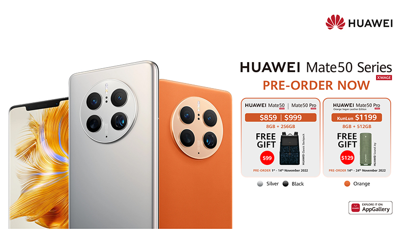 កក់ទុកមុន HUAWEI Mate 50 តម្លៃពិសេស $859 (8GB+256GB) មាន 2 ពណ៌ Black និង Silver ថែមជូន HUAWEI Classic Backpack តម្លៃ រហូតដល់ $99! ចាប់ពីថ្ងៃទី 1 ដល់ 14 វិច្ឆិកា 2022 ។