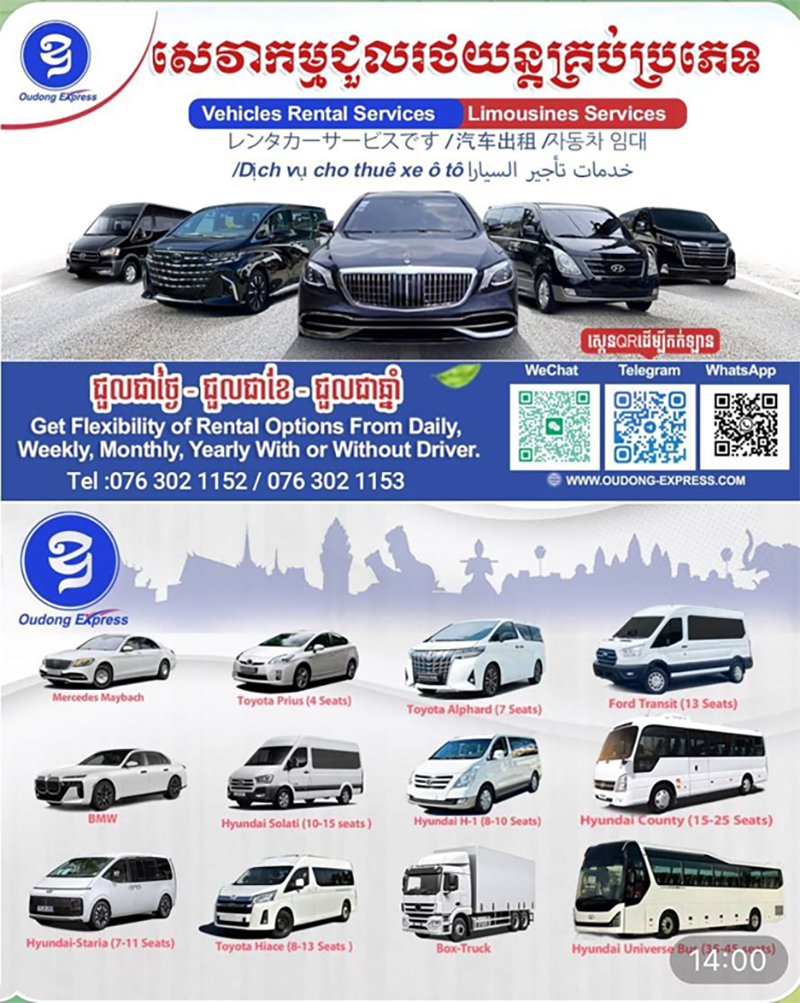 Oudong Express Vehicle Rental Service has all kinds for rent according to customer needs. You can rent for work, short trips, family or companies, enterprises, institutions.
