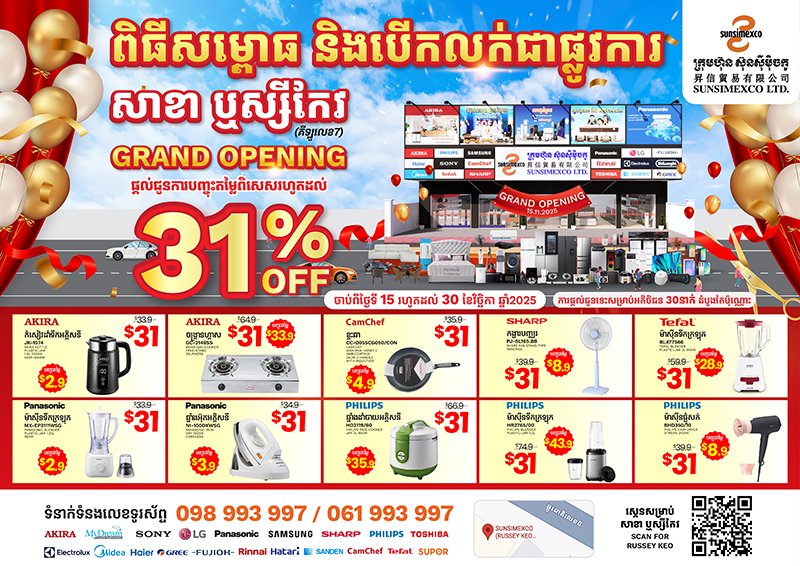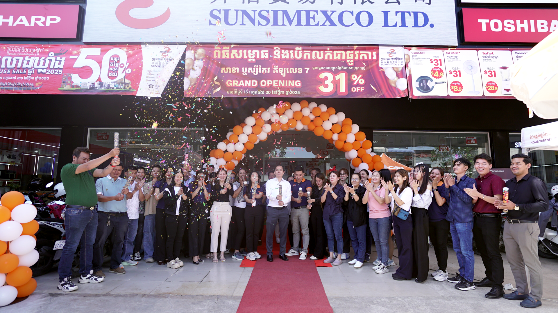 អបអរសាទរក្រុមហ៊ុនស៊ុនស៊ីម៉ិចកូបើកសម្ពោធសាខា ទី31 នៅឬស្សីកែវគីឡូលេខ 7 នៅក្នុងកម្មវិធីនេះដែលក្រុមហ៊ុនបានរៀបចំប្រូម៉ូសិនយ៉ាងពិសេស រាល់អតិថិជនដែលបានមកជាវផ្ទាល់នឹងទទួលបានការលក់បញ្ចុះតម្លៃរហូតដល់ 31% និងមានទំនិញជាច្រើនមុខដែលលក់ក្នុងតម្លៃត្រឹមតែ 31$ តែប៉ុណ្ណោះរួមទាំងថែមជូននូវកាដូជាច្រើនមុខថែមទៀតផង។
