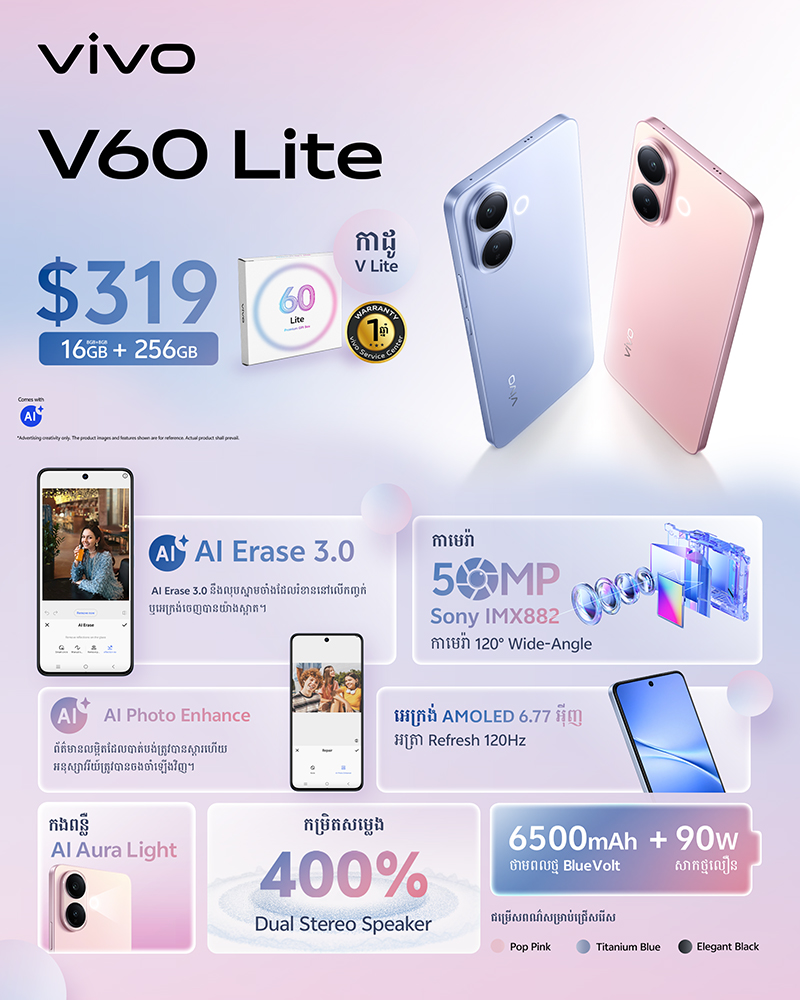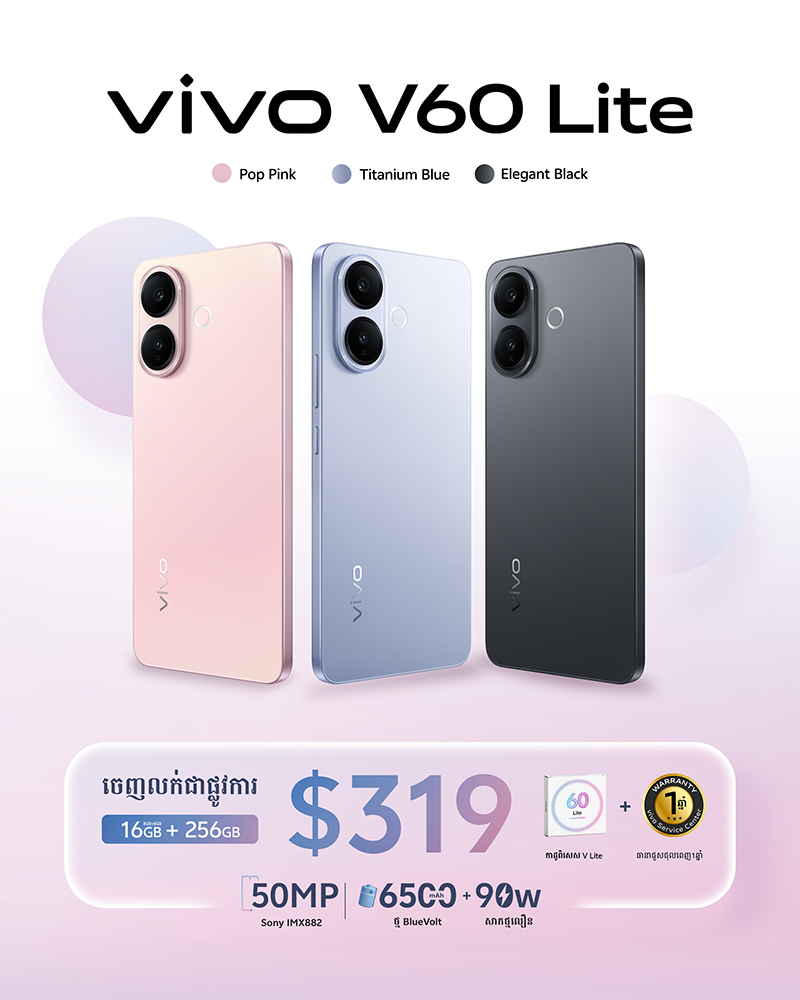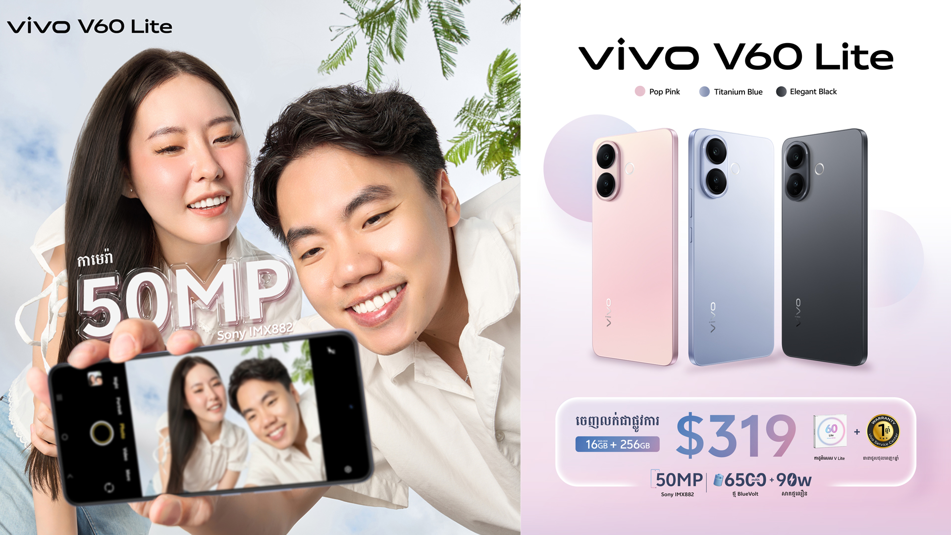 vivo V60 Lite នឹងមានលក់នៅកម្ពុជាចាប់ពីថ្ងៃទី ១៧ ខែវិច្ឆិកា ជាមួយតម្លៃ 319 $ សម្រាប់ព័ត៌មានបន្ថែម សូមចូលទៅកាន់ទំព័រ Facebook របស់ vivo Cambodia សំរាប់ព័ត៌មានបើកលក់ និងការផ្តល់ជូនពិសេសផ្សេងៗ។