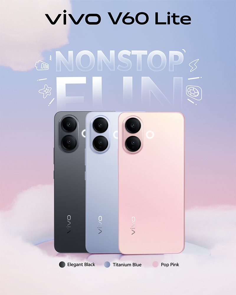 នៅថ្ងៃនេះ ក្រុមហ៊ុន vivo បានប្រកាសចេញផ្សាយស្មាតហ្វូន V60 Lite និងបើកលក់ជាផ្លូវការ ដើម្បីបង្កើតបទពិសោធន៍កម្សាន្តគ្មានដែនកំណត់ថ្មី លើទូរស័ព្ទដៃV60 Lite ។ V60 Lite ត្រូវបានរចនាឡើងជាមួយពណ៌ Pop Pink, Titanium Blue និង ElegantBlack។