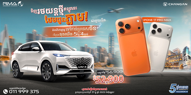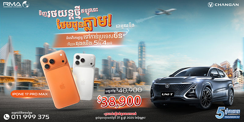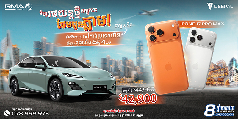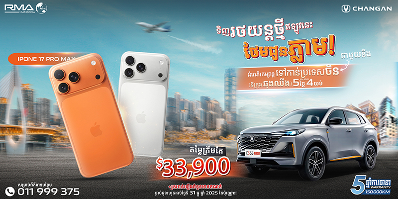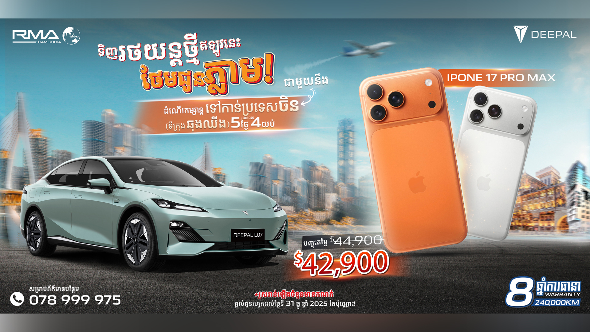ក្រុមហ៊ុន Changan Cambodia & Deepal Cambodia បានបញ្ជាក់ថា ការផ្តល់ជូនពិសេសទាំងតម្លៃ និងកាដូ iPhone 17 Pro Max រួមជាមួយដំណើរកម្សាន្តទៅ Chongqing នេះ មានសុពលភាពចាប់ពីថ្ងៃនេះ រហូតដល់ដំណាច់ខែធ្នូ ឆ្នាំ 2025 តែប៉ុណ្ណោះ។ ដូច្នេះសម្រាប់អតិថិជនដែលមានចំណាប់អារម្មណ៍ អាចអញ្ជើញទៅទស្សនា និងសាកសួរព័ត៌មានលម្អិតនៅទីតាំងអគារតាំងបង្ហាញរថយន្ត Changan Cambodia & Deepal Cambodia ដោយផ្ទាល់ ដើម្បីកុំឱ្យឱកាសដ៏ចំណេញនេះកន្លងផុតទៅ៕