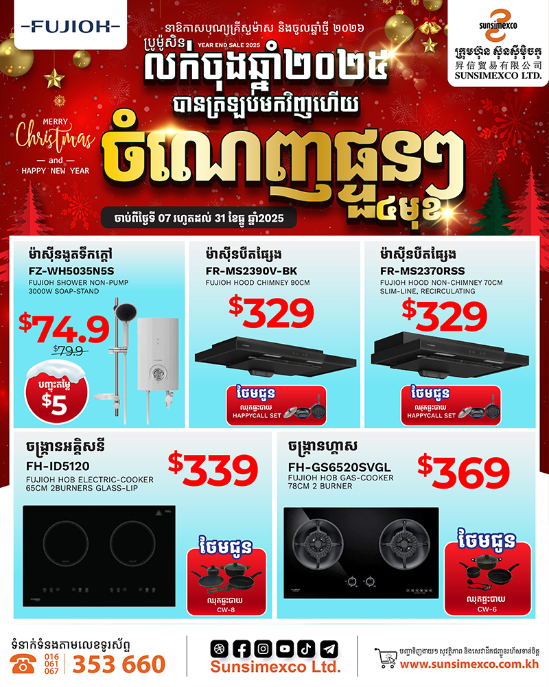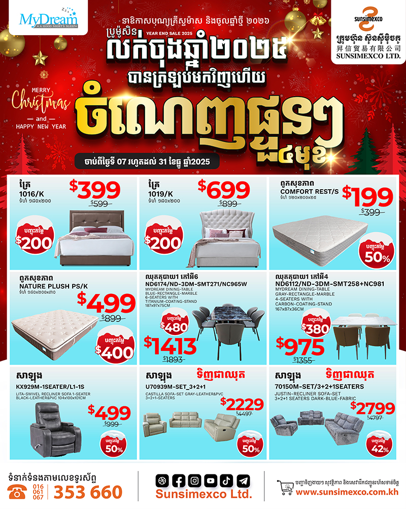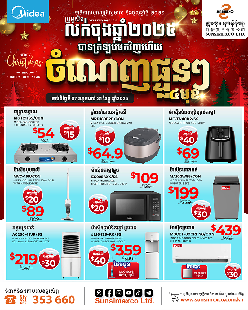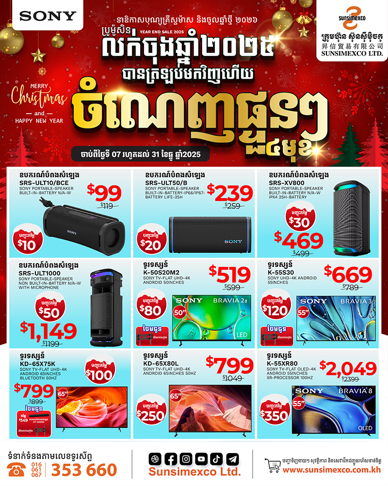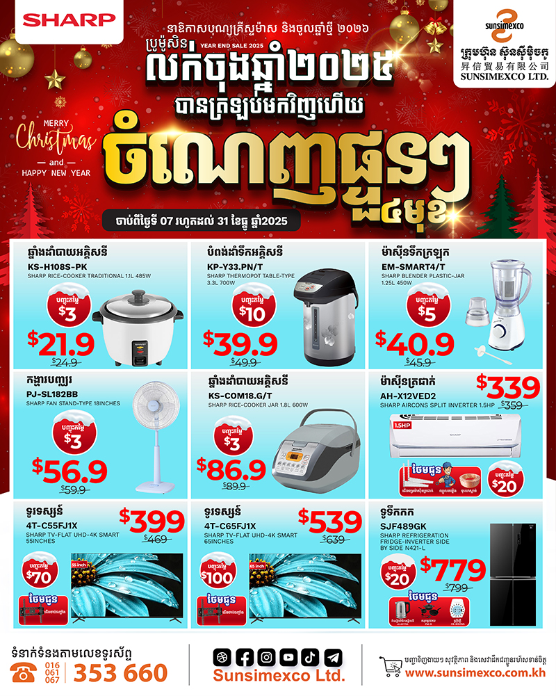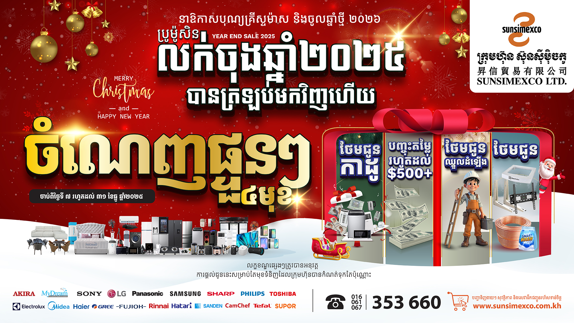នៅដំណាច់ឆ្នាំ ២០២៥ និងស្វាគមន៍ឆ្នាំថ្មី ឆ្នាំ ២០២៦ ខាងមុខនេះក្រុមហ៊ុនស៊ុនស៊ីម៉ិចកូ បានរៀបចំកម្មវិធីលក់បញ្ចុះតម្លៃយ៉ាងច្រើន រាល់ការជាវគ្រឿងអេឡិចត្រូនិច គ្រឿងសង្ហារឹម និងទូរស័ព្ទដៃគ្រប់ប្រភេទទាំងអស់ ពីសាខាណាមួយរបស់ ស៊ុនស៊ីម៉ិចកូ ក្នុងប្រូម៉ូសិនលក់ចុងឆ្នាំនេះ អតិថិជននឹងទទួលបានការថែមជូនកាដូផ្ទួនៗគ្នារហូតដល់ ៤ មុខដូចជា៖