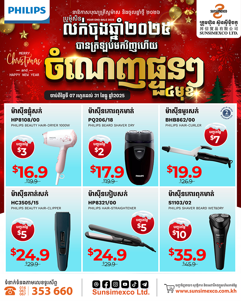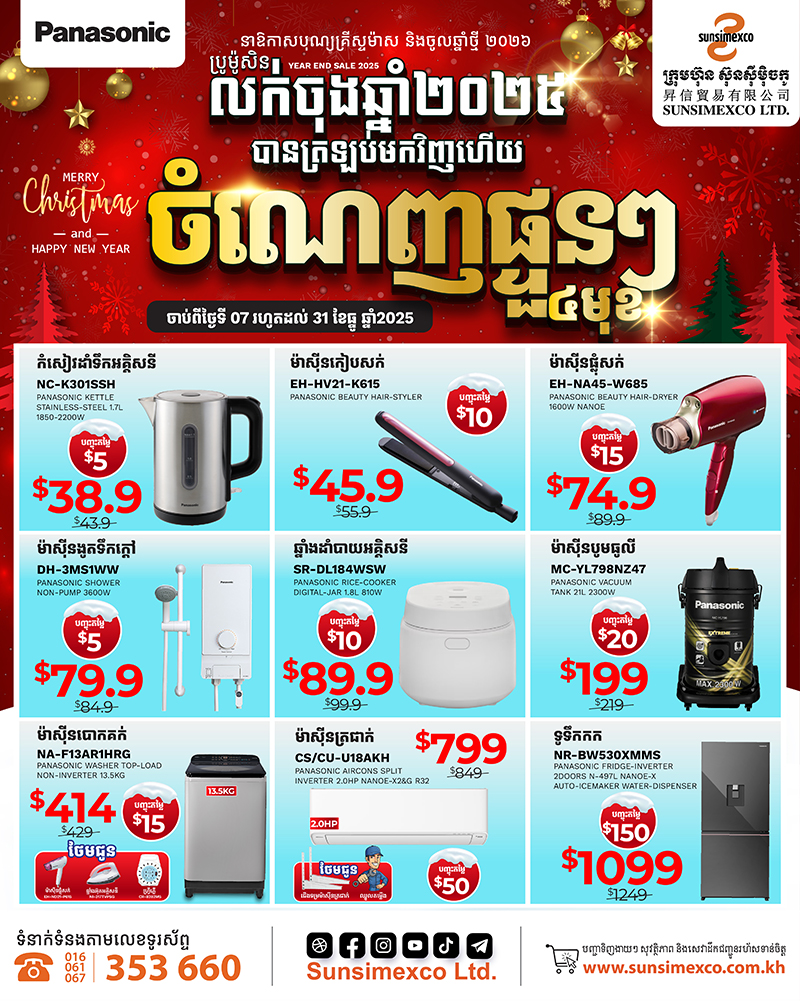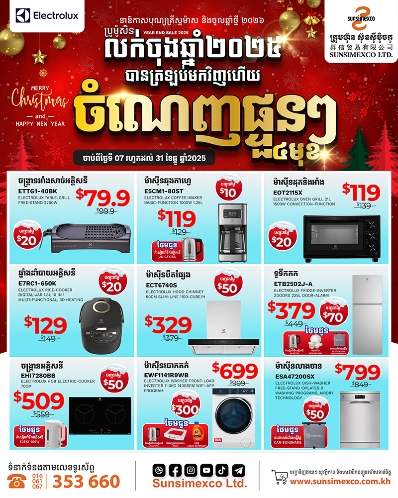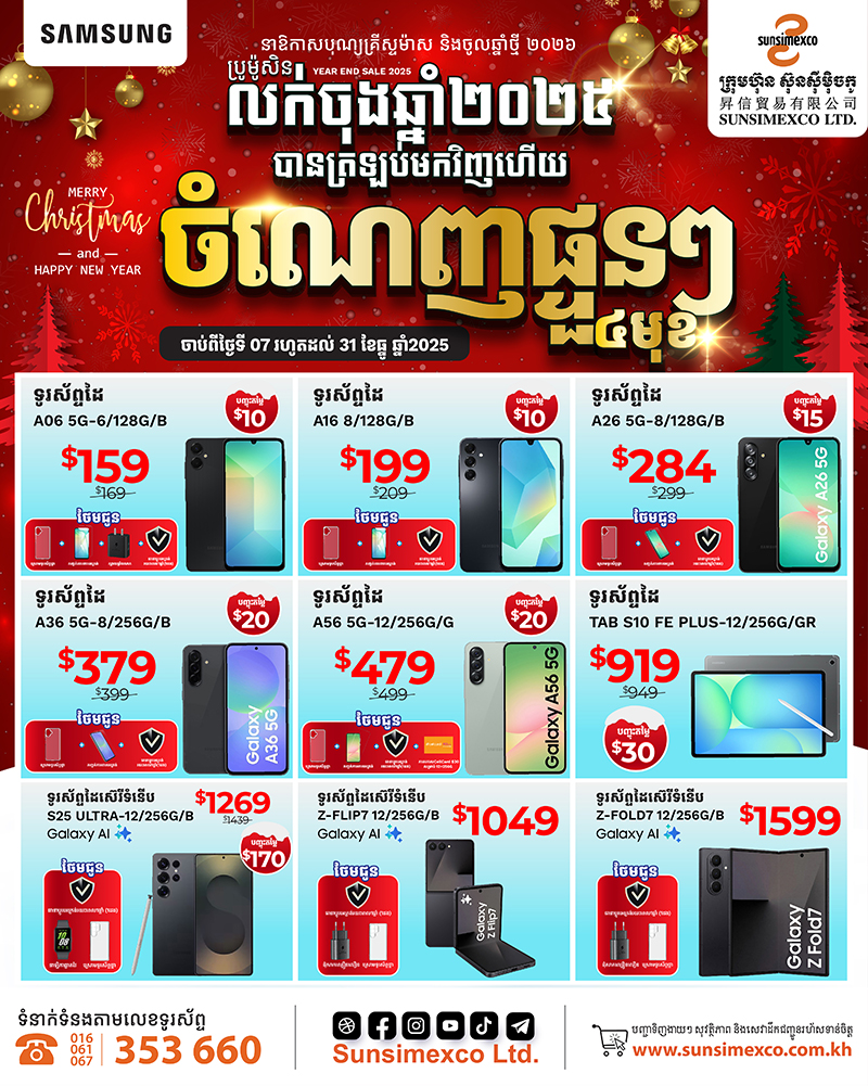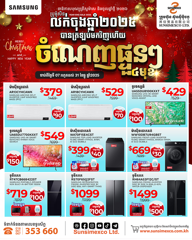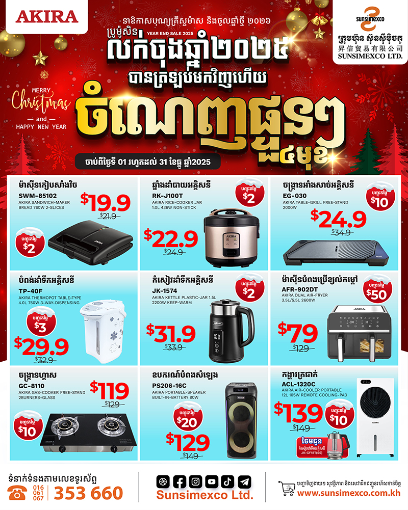 នៅដំណាច់ឆ្នាំ ២០២៥ និងស្វាគមន៍ឆ្នាំថ្មី ឆ្នាំ ២០២៦ ខាងមុខនេះក្រុមហ៊ុនស៊ុនស៊ីម៉ិចកូ បានរៀបចំកម្មវិធីលក់បញ្ចុះតម្លៃយ៉ាងច្រើន រាល់ការជាវគ្រឿងអេឡិចត្រូនិច គ្រឿងសង្ហារឹម និងទូរស័ព្ទដៃគ្រប់ប្រភេទទាំងអស់ ពីសាខាណាមួយរបស់ ស៊ុនស៊ីម៉ិចកូ ក្នុងប្រូម៉ូសិនលក់ចុងឆ្នាំនេះ អតិថិជននឹងទទួលបានការថែមជូនកាដូផ្ទួនៗគ្នារហូតដល់ ៤ មុខដូចជា៖