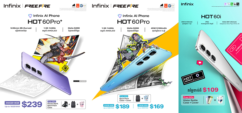Infinix បានប្រកាសចេញលក់នូវ HOT60Pro Series ចុងក្រោយបំផុតរបស់ខ្លួន ដែលសហការជាមួយ FreeFire ក្នុងនោះដោយ Infinix HOT 60 Pro+ បានកំណត់និយមន័យឡើងវិញនូវការរចនាស្មាតហ្វូនស្ដើងជាមួយនឹងតួខ្លួនស្ដើងបំផុតត្រឹមតែ 5.95mm ប៉ុណ្ណោះ វាបានកំណត់ស្តង់ដារសកលថ្មីជាទូរស័ព្ទអេក្រង់កោង 3D ស្ដើងបំផុតរបស់ពិភពលោក។