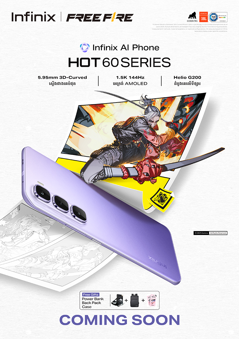 ជាមួយនឹងកិច្ចសហការ FreeFire ក្រុមហ៊ុន Infinix បានប្រើប្រាស់បន្ទះឈីបហ្គេម Helio G200 របស់ MediaTek ដែលត្រូវបានភ្ជាប់ជាមួយ RAM ទំហំ 8GB (អាចបន្ថែមបាន 8GB) និងអង្គផ្ទុកទិន្នន័យទំហំ 256GB សម្រាប់ការលេងហ្គេមដ៏រលូន។ ក្នុងនាមជាសមិទ្ធផលចុងក្រោយបំផុតនៃការច្នៃប្រឌិតជាបន្តបន្ទាប់របស់ Infinix ហើយ HOT ស៊េរី តំណាងឱ្យរូបតំណាងបច្ចេកវិទ្យា-ម៉ូដជំនាន់ក្រោយ ដែលត្រូវបានរចនាឡើងដើម្បីបំពេញតម្រូវការរបស់អ្នកប្រើប្រាស់វ័យក្មេងទូទាំងពិភពលោក។ រួមជាមួយ HOT 60Pro+ ក្រុមហ៊ុន Infinix ក៏នាំមកជាមួយ HOT 60Pro និង HOT 60i សម្រាប់ទីផ្សារកម្ពុជា។