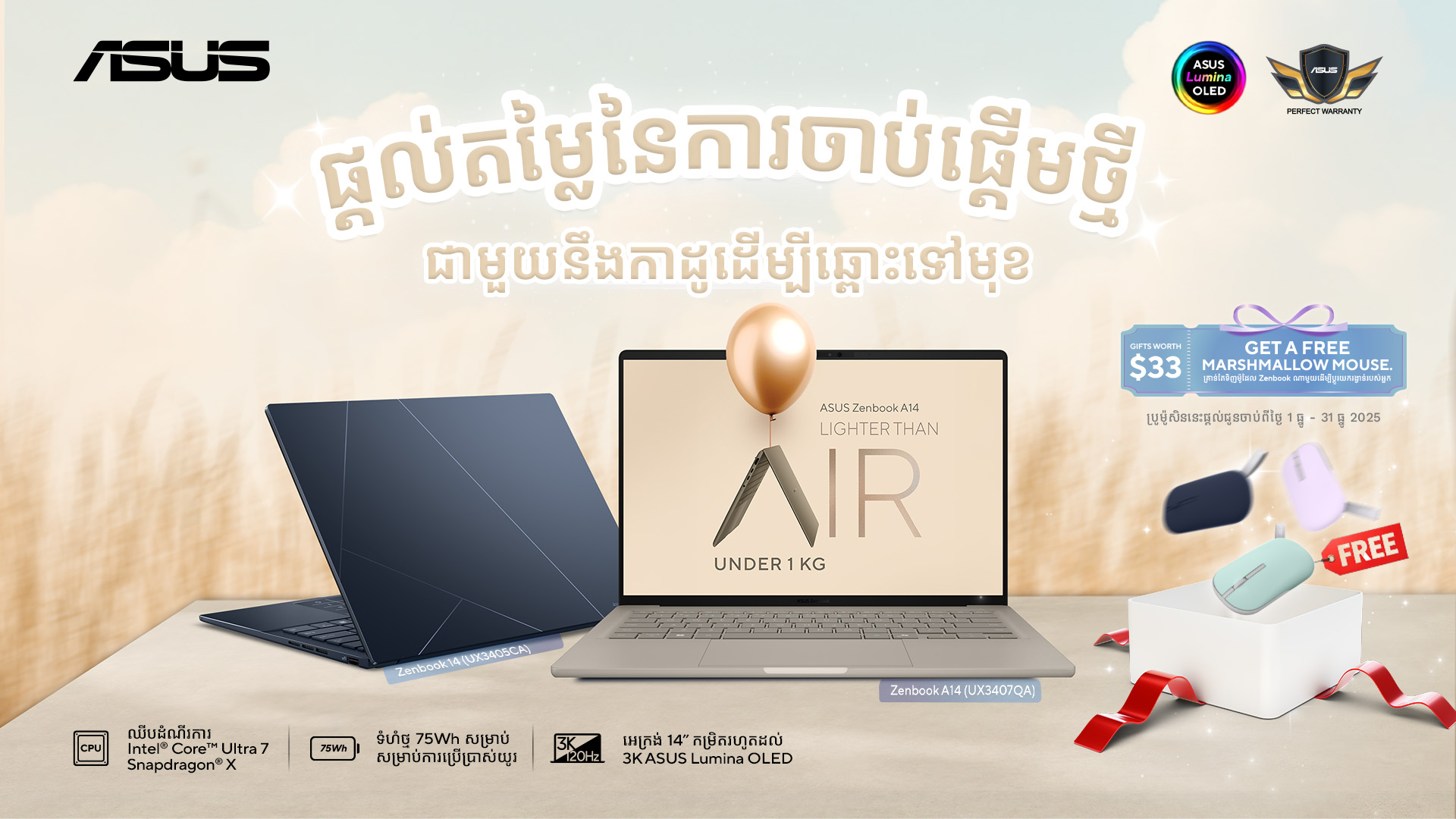 ASUS រីករាយក្នុងការផ្តល់ជូននូវការផ្សព្វផ្សាយពិសេសចុងឆ្នាំសម្រាប់អតិថិជនកម្ពុជានឹងទទួលបាន ASUS Marshmallow Mouse (MD100) មួយ ដោយឥតគិតថ្លៃ រាល់ការទិញម៉ូដែល Zenbook ដែលមានដូចជា៖ Zenbook S14 (UM3406KA), Zenbook A14 (UX3407QA), Zenbook S16 (UM5606KA), Zenbook 14 (UX3405CA), និង Zenbook DUO (UX8406CA)។ រយៈពេលប្រូម៉ូសិន: ចាប់ពីពេលនេះ រហូតដល់ថ្ងៃទី 31 ខែ ធ្នូ ឆ្នាំ 2025។