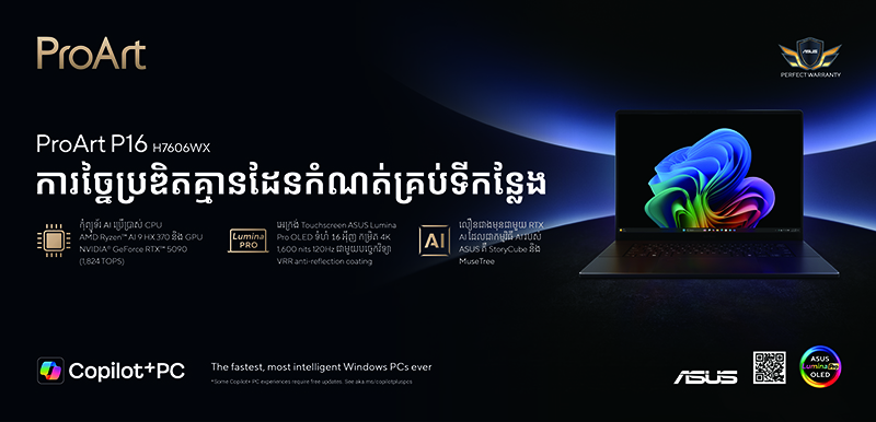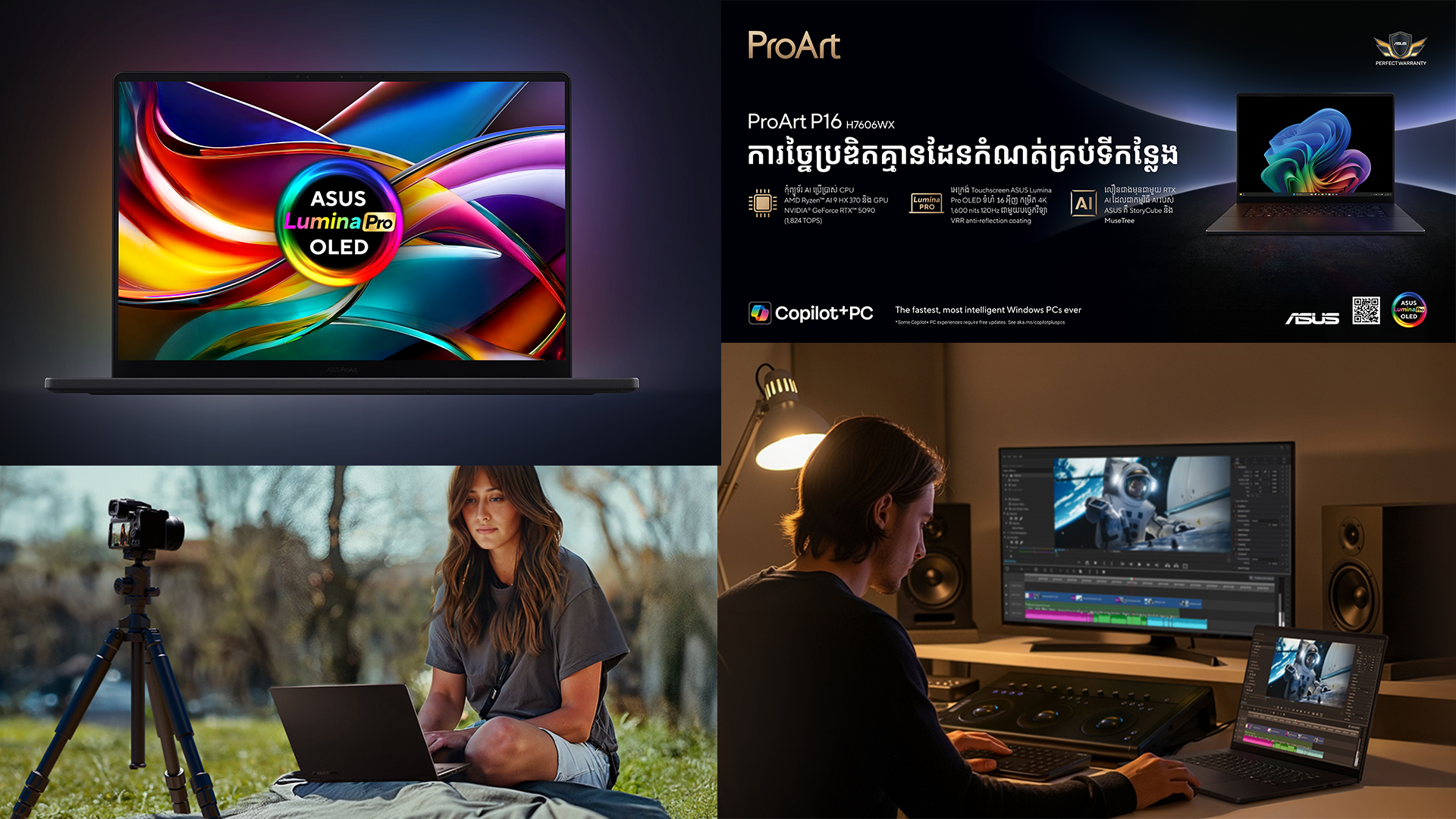 នៅថ្ងៃទី 25 ខែធ្នូ ឆ្នាំ2025 – ASUS Cambodia ថ្ងៃនេះបានប្រកាសដាក់លក់ ProArt P16 (H7606WX) ដែលជាកុំព្យូទ័រយួរដៃសម្រាប់អ្នកបង្កើតខ្លឹមសារដ៏អស្ចារ្យបំផុត ដែលត្រូវបានរចនាឡើងដើម្បីជំរុញសមត្ថភាពអ្នកជំនាញវីដេអូទាំងនៅក្នុងស្ទូឌីយោ និងពេលធ្វើដំណើរ។