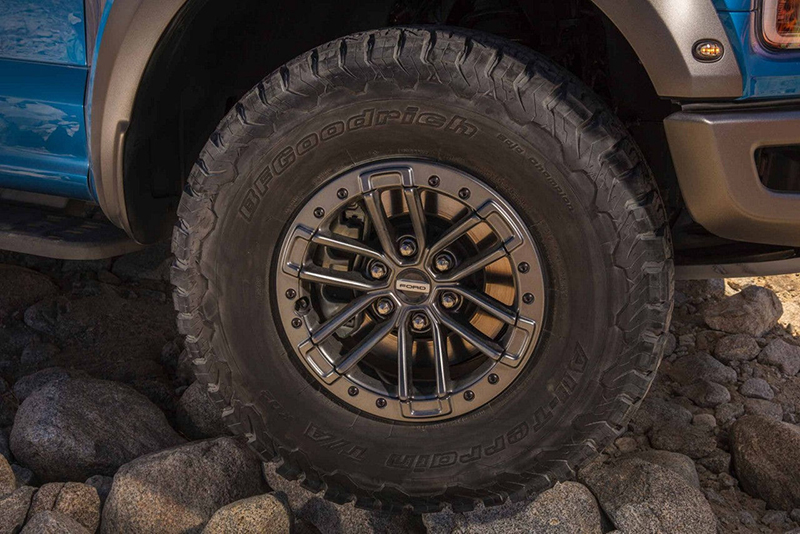 មិនតែប៉ុណ្ណោះ ដៃឃ្លោង និងស្លាបប្រជៀវរបស់ Ford F-150 Raptor គឺធំៗមែនទែន ស័ក្កសមនឹងឈ្មោះ Raptor ជាភីកអាប់ខ្នាតធំដ៏អំណាច ហើយថែមទាំងបានបំពាក់នូវ សំបកកង់ All-terrain Tires ទំហំ 37 អ៊ីញ ក្រឡា Cross ជាកង់ Off-road និង យ៉ាន់កង់ទំហំ 17 អ៊ីញ ទៀតផង។