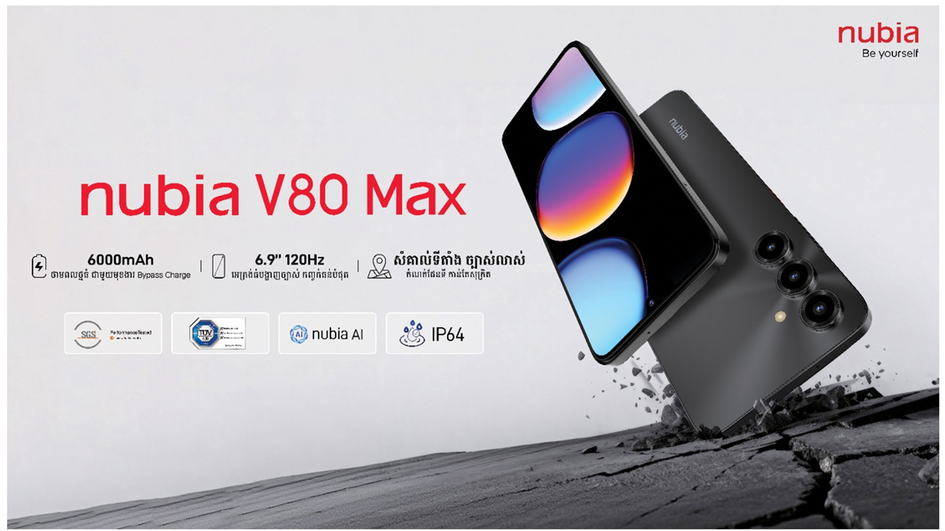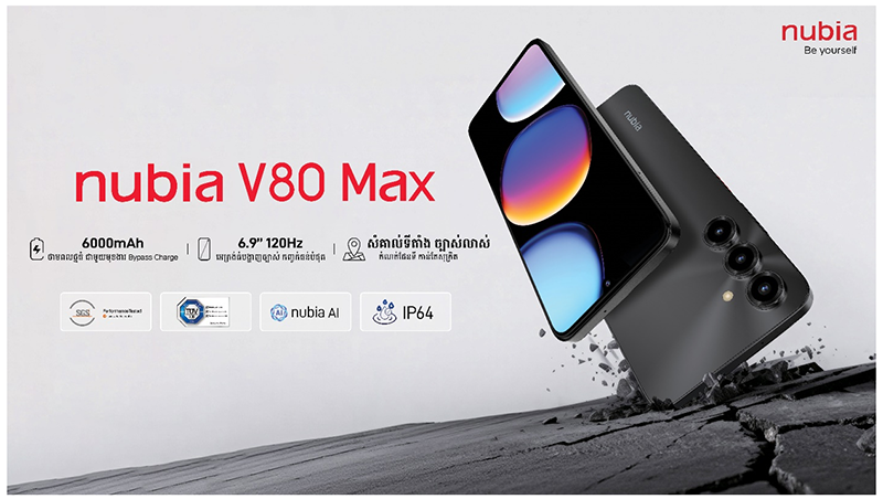 ក្រុមហ៊ុន nubia ដែលជាក្រុមហ៊ុនបច្ចេកវិទ្យាឈានមុខគេ មានកិត្តិយសសូមប្រកាសបង្ហាញជាផ្លូវការនូវម៉ូឌែលថ្មីរបស់ខ្លួនគឺ nubia V80 Max ដែលជាស្មាតហ្វូនជំនាន់ថ្មី ត្រូវបានរចនាឡើងយ៉ាងពិសេសសម្រាប់អ្នកប្រើប្រាស់ដែលស្រលាញ់ទូរស័ព្ទមាន អេក្រង់ធំថ្មប្រើបានយូរ និងមានភាពធន់រឹងមាំហើយបំពាក់បច្ចេកវិទ្យាទំនើបៗ សមស្របបំផុតសម្រាប់ការប្រើប្រាស់ប្រចាំថ្ងៃ និងការកម្សាន្តផ្សេងៗ។