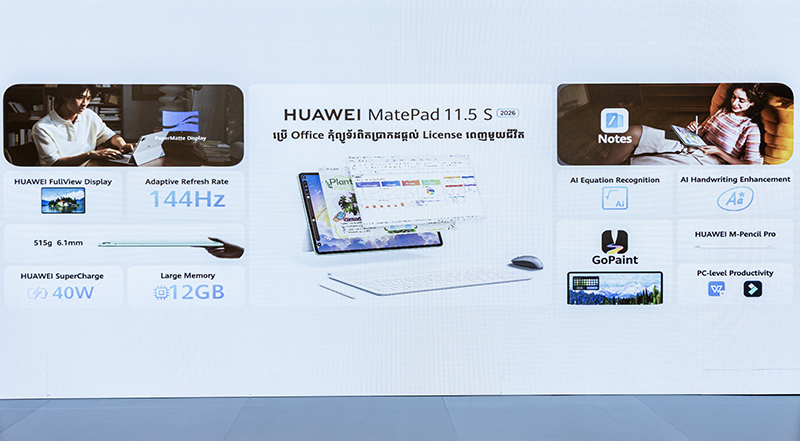 លែងត្រូវការ laptop ធំធ្ងន់រញ៉េរញ៉ៃស្ពាយតាមខ្លួនទៀតហើយ មានតែថេប្លេតមួយនេះអាចជំនួសការងាររបស់យើងបានមួយចប់តែម្តង! នេះគឺជាថេប្លេតលំដាប់លេខ១ ប្រើ Office, Word, Excel, PowerPoint, បញ្ចាំងស្លាយពី projector និង print ឯកសារ, ប្រើកម្មវិធី AI ទាំងអស់, ថែមទាំងបំពាក់អេក្រង់គ្មានចំណាំងផ្លាត PaperMatte, ហើយនេះគឺ HUAWEI MatePad 11.5 S PaperMatte 2026