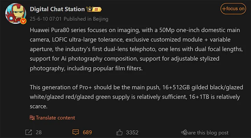 Huawei Pura 80 Pro+ ទំនងជានឹងមានការប្រើប្រាស់រ៉េម 16GB និងម៉េមូរី 1TB