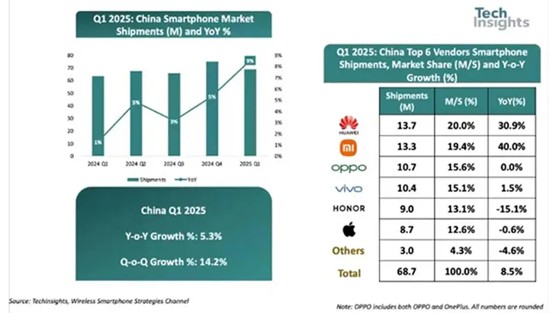 Huawei ឈរលើកំពូលតារាងទីផ្សារស្មាតហ្វូនរបស់ចិន ខណៈApple ធ្លាក់ដល់លេខ 5 នៅត្រីមាសទី 1 ឆ្នាំ 2025 នេះ