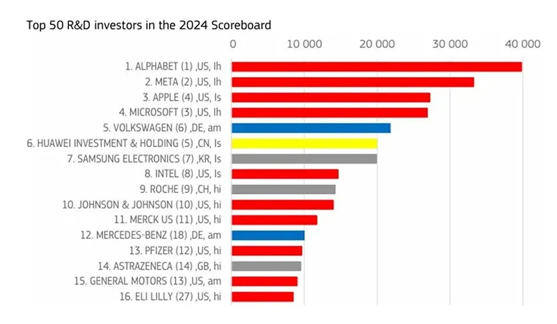 Huawei ឈរនៅលើចំណាត់ថ្នាក់លេខ 6 នៅក្នុងបញ្ជី Global Top 100 R&D ឆ្នាំ 2024